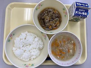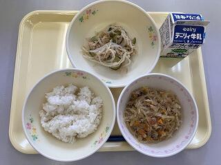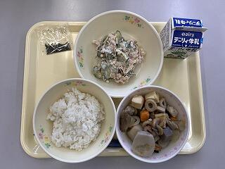 7/4(火)のメニューは『煮しめ』『納豆サラダ』『刻みのり』『麦ごはん』『牛乳』でした。