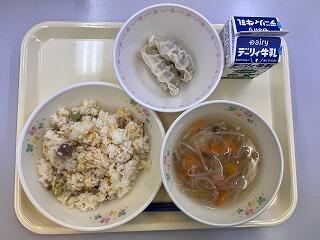 7/5(水)のメニューは『焼きぎょうざ』『チャーハン』『ワンタンスープ』『牛乳』でした。