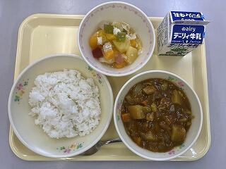 8/25(金)のメニューは『チキンカレー』『ごはん』『フルーツポンチ』『牛乳』でした。