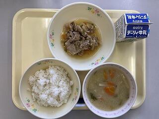 11/13(月)のメニューは『さつま汁』『豚肉のしょうが焼き』『麦ごはん』『牛乳』でした。