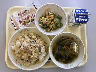 11/15(水)のメニューは『りっちゃんサラダ』『チャーハン』『わかめスープ』『チョコクレープ』『牛乳』でした。