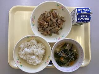 11/22(水)のメニューは『きのこ汁』『鶏肉とごぼうの揚げ煮』『麦ごはん』『牛乳』でした。
