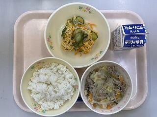 5/17(金)のメニューは『豚肉と春雨のカラフル炒め』『もやしナムル』『麦ごはん』『牛乳』でした。