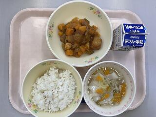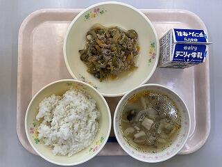 5/22(水)のメニューは『きのこスープ』『豚肉とナスのみそ炒め』『麦ごはん』『牛乳』でした。