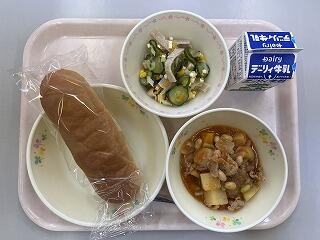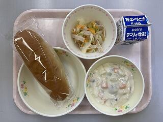 5/23(木)のメニューは『オニオンサラダ』『黒糖パン』『クリームシチュー』『牛乳』でした。