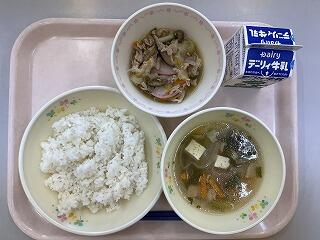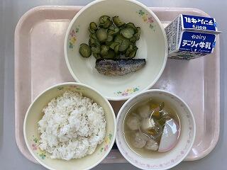 5/24(金)のメニューは『ごぼう団子のつみれ汁』『いわしおかか煮』『きゅうりのスタミナ漬け』『麦ごはん』『牛乳』でした。