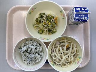 5/29(水)のメニューは『わかめごはん』『日向夏ドレッシングサラダ』『きつねうどん』『牛乳』でした。