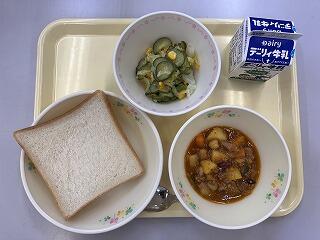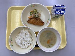 麦ごはん、からいも汁、アジフライ、もやしのナムル
