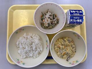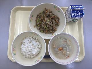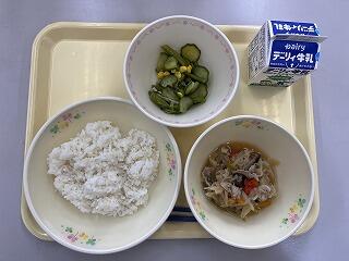 麦ごはん、呉汁、茎わかめのきんぴら
