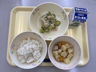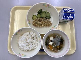麦ごはん、なめこ汁、ホキ天玉あげ、きゅうりのピリ辛漬け