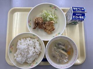 麦ごはん、もやしのみそ汁、鶏の唐揚げ、添えキャベツ