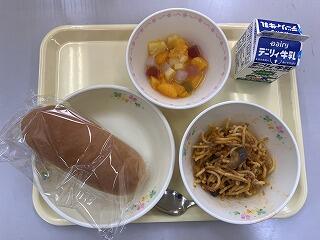 コッペパン、なすのミートスパゲティ、フルーツポンチ
