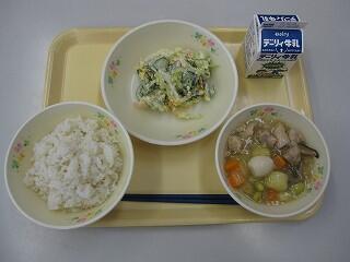 献立は、ミルクパン、冬野菜のシチュー、りっちゃんサラダです。シチューは、ブロッコリー、かぶなどの冬野菜や鶏肉が柔らかく濃厚な味で美味しいです。サラダは、キャベツやきゅうり、ハムなどがたくさん入っています。昆布やかつお節の味がきいてとても美味しくいただきました。
