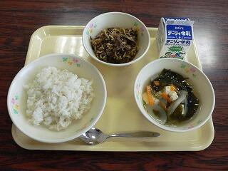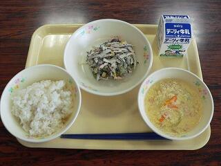 献立は、麦ご飯、かき玉汁、ひじきとゴボウのサラダでした。かき玉汁は、卵がふわふわとろとろで、肉の旨味と野菜の甘みが溶け込んでいました。サラダは、マヨネーズ味にコーンが入っており甘く、かみ応えもあり、子どもたちの健康にも良さそうでした。おいしくいただきました。
