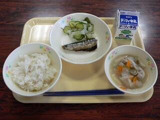 献立は、麦ご飯、鰯の梅煮、甘酢和え、米粉のだご汁でした。鰯の梅煮は、身がとても柔らかく、ご飯のおかずにぴったりでした。甘酢和えは、酢の加減も丁度よく、大根の歯ごたえがありました。だご汁は、団子がもちもちで、鶏肉の風味がよく出ていました。おいしくいただきました。