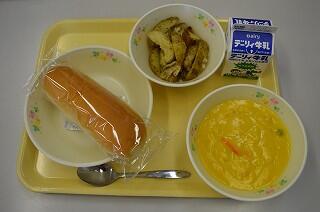 献立は、コッペバン、ジャーマンポテト、カボチャポタージュ、ブルーベリージャムでした。ポタージュは、濃厚でカボチャの甘みが口の中に広がって美味しいです。ジャーマンポテトは、ベーコンも入っていて、美味しく味付けされています。