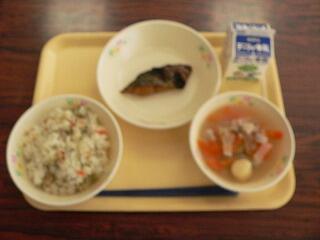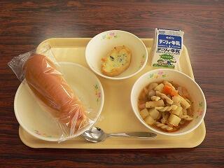 献立は、ミルクパン、パスタ入りブイヤベース、ポテトカップのグラタンでした。今日は洋風のメニューでした。ブイヤベースは、魚貝と香味野菜の風味がスープに溶け込んでいました。グラタンは、ジャガイモとチーズの甘みがあり、香ばしい一品でした。ミルクパンと一緒においしくいただきました。