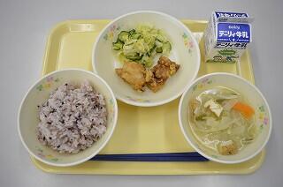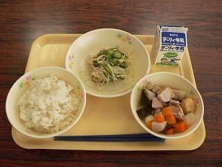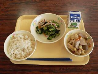 献立は、麦ごはん、筑前煮、いかの酢の物でした。筑前煮は、具材に味がしみており、ごはんとの相性もぴったりでした。いかの酢の物は、さわやかな酸味といかのコリコリとした触感があり、野菜と一緒においしくいただきました。
