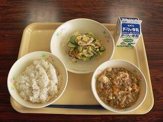 献立は、麦ご飯、麻婆豆腐、コールスローサラダでした。麻婆豆腐は、豚挽肉の旨味たっぷりで、ほどよい辛みがありました。サラダは、キャベツや人参がシャキシャキしていて、マヨネーズで味が調えられていました。おいしくいただきました。
