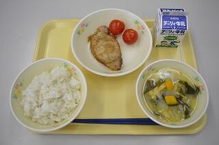 今日は【地産地消献立】で、麦ご飯、豚肉の生姜焼き、かぼちゃのみそ汁、ミニトマトです。生姜焼きは、豚肉が柔らかくちょうどよい厚さで食べやすいです。すり下ろしりんごも入った甘辛い生姜の味付けでご飯がすすみます。みそ汁は、玉ねぎやわかめ、油揚げなどがたくさん入っています。かぼちゃの甘味がとても美味しいです。