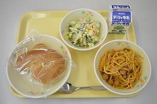 献立は、黒糖パン、スパゲティナポリタン、チーズサラダです。スパゲティは、しめじやウィンナーが入っていて美味しいです。サラダは、きゅうりやキャベツなど野菜がシャキシャキした歯ごたえで、5ミリ角のたくさんのチーズの味が効いて美味しいです。パンは柔らかく、黒糖の味が美味しいです。