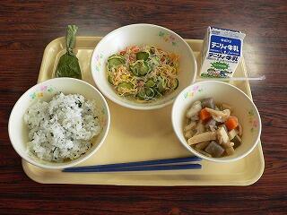 献立は、大根葉ご飯、筑前煮、春雨サラダ、笹団子でした。大根葉ご飯は、塩加減も丁度よく、大根葉がよく混ぜてありました。福岡県の郷土料理、筑前煮は、具材に味がしみていて、ご飯のおかずにぴったりでした。春雨サラダは、錦糸卵や春雨、人参やきゅうり・かまぼこなどが入り、色鮮やかでさわやかな味に仕上がっていました。デザートに、笹団子まであり、とてもおいしくいただきました。