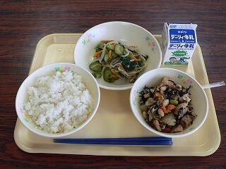 献立は、麦ご飯、鶏肉と大豆のひじき煮、おかか和えでした。煮物は、健康によい大豆とひじきがたっぷり入っており、鶏肉の旨味たっぷりの一品でした。ジャガイモや揚げ豆腐も入り、ボリュームもありました。おかか和えは、シャキシャキの野菜がおかかと調味料でさわやかに味付けされていました。どれもおいしくいただきました。