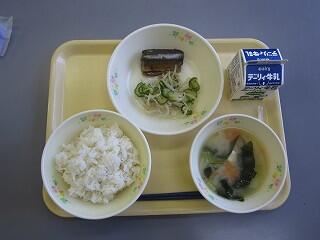 今日の献立は、麦ご飯、秋刀魚の生姜煮、もやしときゅうりのごま和え、小松菜の味噌汁、牛乳です。味噌汁は、小松菜の味がみそと合っていて自然のうま味が出ていました。