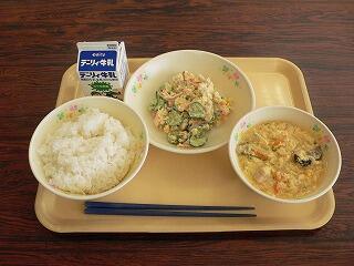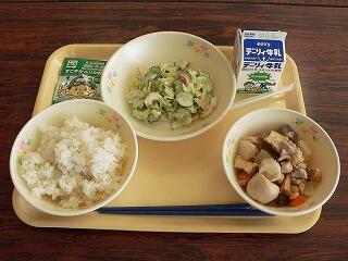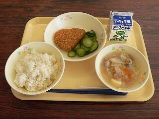 献立は、麦ご飯、カボチャコロッケ、かっぱ漬け、かねんしゅいでした。コロッケは、サクサクの衣とカボチャの甘みが特徴的でした。かっぱ漬けは、ほどよい塩加減に漬かったきゅうりがごま油で和えてあり、ゴマの風味が感じられました。かねんしゅいは、サツマイモのデンプンで作った団子が入った郷土料理で、野菜もたくさん入っていました。おいしくいただきました。