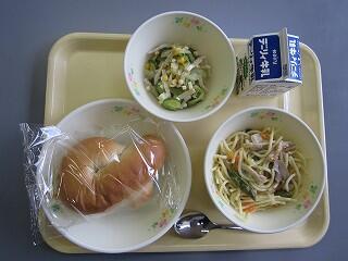 今日の献立は、黒糖パン、きのこのスパゲティ、チーズサラダ、牛乳です。黒糖パンは、甘く柔らかくて、口の中でやさしい味がしました。きのこのスパゲティは、きのこの味が目立つように、他の味が控えめでした。チーズサラダは、チーズがサラダをさらに美味しくしてくれていました。今日も美味しくいただきました。