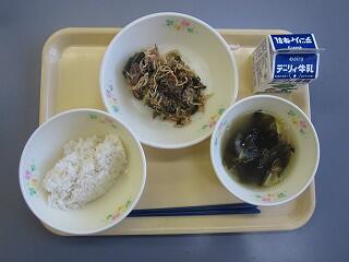 今日の献立は、ビビンバ丼、わかめスープ、牛乳です。