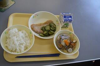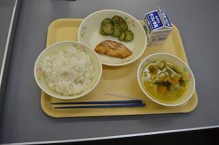 今日の献立は、麦ご飯、鯛のピリ辛焼き、きゅうりのおかか和え、かぼちゃの味噌汁、牛乳です。