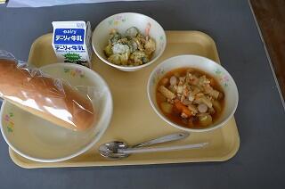 今日の献立は、コッペパン、パスタ入りブイヤベース、サツマイモサラダ、牛乳です。