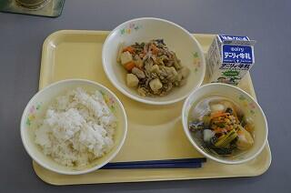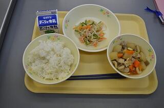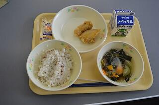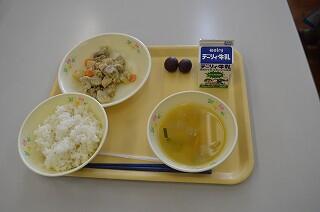 今日の献立は、麦ご飯、鶏肉の味噌ころばかし、かねんしゅい、ぶどう、牛乳です。今日はこばやし地産地消の日でした。味噌ころばかしは、鶏肉が柔らかく味噌にからまっていて美味しかったです。小林でとれた野菜がたくさん使われていました。かねんしゅいは、柔らかい芋餅が入っていました。ブドウは、ニューピオーネでとても甘かったです。