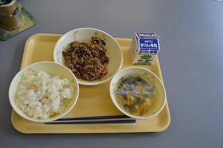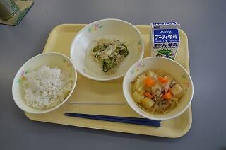 今日の献立は、麦ご飯、豚肉と厚揚げの味噌炒め、なめこ汁、牛乳です。豚肉と厚揚げの味噌炒めは、豚肉と厚揚げが味噌味でうまく絡まり美味しさが増しました。また、ピーマンや人参、なすなど野菜もたっぷりで彩りもよく食欲をそそりました。なめこ汁は、なめことがんもどき、小松菜など具だくさんでした。今日も美味しくいただきました。