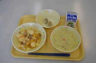 今日の献立は、キムタクご飯、シューマイ、コーンクリームスープ、牛乳です。