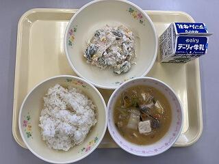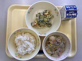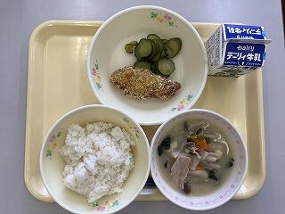 11/8(水)のメニューは『こばっこみそ汁』『ホキ天玉あげ』『きゅうりのスタミナ漬け』『麦ごはん』『牛乳』でした。