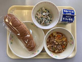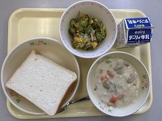 11/2(木)のメニューは『オニオンドレッシングサラダ』『食パン』『秋の味シチュー』『牛乳』でした。