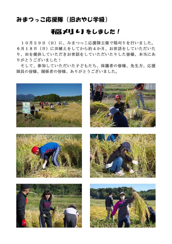 みまつっこ応援隊主催の田植え、稲刈りにたくさんのご参加ありがとうございました。精米ができましたので参加された方はお手数ですが小学校、教頭先生までお米の引き取りをお願いします。