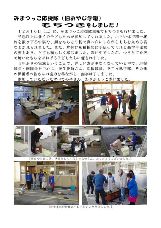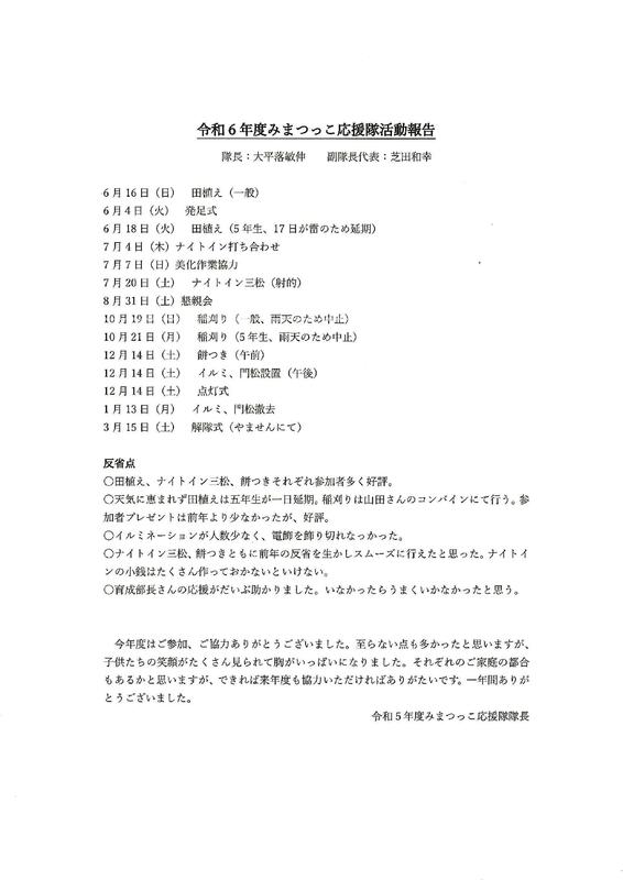 みまつっこ応援隊主催の田植えへの参加、稲刈りへの申込みありがとうございました。精米ができましたので、田植えに参加された方及び稲刈りに参加予定だった方へ、お米をプレゼントします。お手数ですが小学校、教頭先生までお米の引き取りをお願いします。