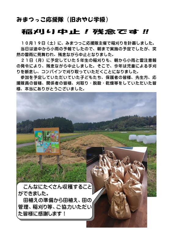 本日予定しておりましたみまつっこ応援隊主催の稲刈りは、悪天候のため中止します。