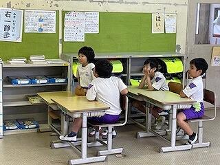 2年生は国語科の学習では、絵に合うように、「はじめ」「中」「おわり」の順にストーリーを考えようとしとしていました。友だちがアドバイスする場面も見られました。想像力を広げて文をつくる面白そうな学習です。道徳の時間では「きまりのない学校」という資料を使って学習していました。「決まりなんてない方がいい」と思っていた主人公が夢の中できまりない学校に行き、苦労する経験を通して、改めてきまりを守ることの大切さに気付かされるという内容です。自分でじっくり考えたり、友だちと意見交流したりしながら、考えを深めていました。明日からの2年生が楽しみです。休み時間など、教室や廊下で暴れる人はいないでしょう!