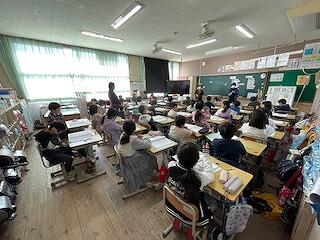 2年生は図工科で、紙袋に新聞紙などをつめて形をつくり作品をつくっていました。算数科では、いくつかの図形の中から三角形や四角形を見つける学習をしていました。音楽科では楽しそうに先生の伴奏に合わせて、鍵盤ハーモニカをひいていました。
