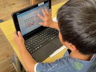 2年生は国語科の学習で電子紙芝居をつくったり、算数の振り返りの問題を解いて終わったら点検してもらったりしていました。