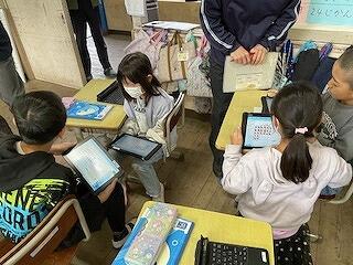 6学年はタブレットで調べ物をしたり、外国語科の学習で、いろいろなペアで英会話をしたり、算数科の拡大縮小のまとめの問題をしたりしていました。