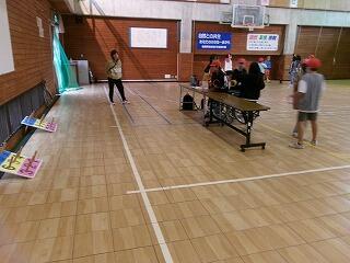 活動3「追跡ハイキング」の様子です。あいにくの雨で室内でのハイキングになりましたが、班のみんなで協力して、様々なゲームにチャレンジします。各チェックポイントには職員がつき、ゲームの得点に加え、あいさつや片付けなどの態度も加味され、得点が合計され、翌日に3位まで表彰されます。写真は、ムカデ板競争、輪投げ、縄跳びの様子です。