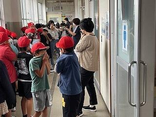 10月29日(火)、火災を想定した避難訓練を行いました。当日は雨でしたので、理科室から出火し、一次避難として、北校舎の1・4・6年がまず、中校舎に避難し、その後、二次避難として、全学年が体育館に避難する練習をしました。全員、鼻にマスクをあて、「おかしも(おさない、はしらない、しゃべらない、もどらない)」の合言葉を守って、安全かつ迅速に避難できました。一次避難にかかった時間はわずか2分2秒でした!すごいですね!全員が避難したら、消防署の方に、訓練の講評と避難時の注意をしていただきました。