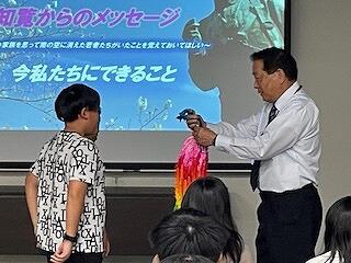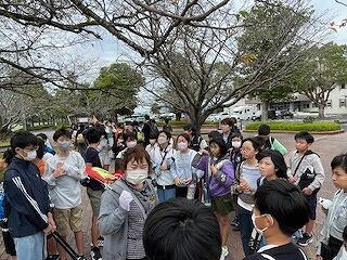 見学地1「知覧特攻平和会館」の様子です。施設の周りにある記念碑や銅像などをみたり、特攻で亡くなられた方の遺品をみたり、語り部の方のお話を聞いたりしました。自然と涙がこぼれた児童もいたようです。戦争の悲しさや平和の尊さを強く心に刻む時間となったようです。平和を祈ってみんなで織った千羽鶴もお贈りしました。