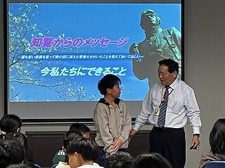 11月3日(日)、小林市市民表彰式がありました。今年度4名の方が表彰されましたが、その中のおひとりに、三松地区から「福留健一様」が受賞されました。三松地区の見守り隊の活動や地域だけでなく県内全域で講演活動を行い、生涯学習の発展に努められたことが称されての受賞でした。福留様は、今現在も三松小の正門に毎朝立たれ、子どもたちにやさしい言葉かけをしてくださっています。受賞、本当におめでとうございます。