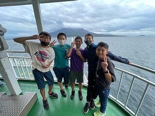 フェリー乗船の様子です。雨天だったら中止も検討していましたが、ラッキーなことに天候はくずれず予定通り乗船できました。桜島が噴火しているところを、船に乗りながらみることができました。風がとても気持ちよかったです!